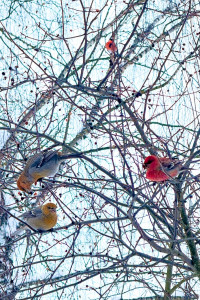 Winter meal:bird on a branch with an apple"