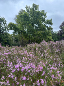 Поляна вереска и дуб в лесу
