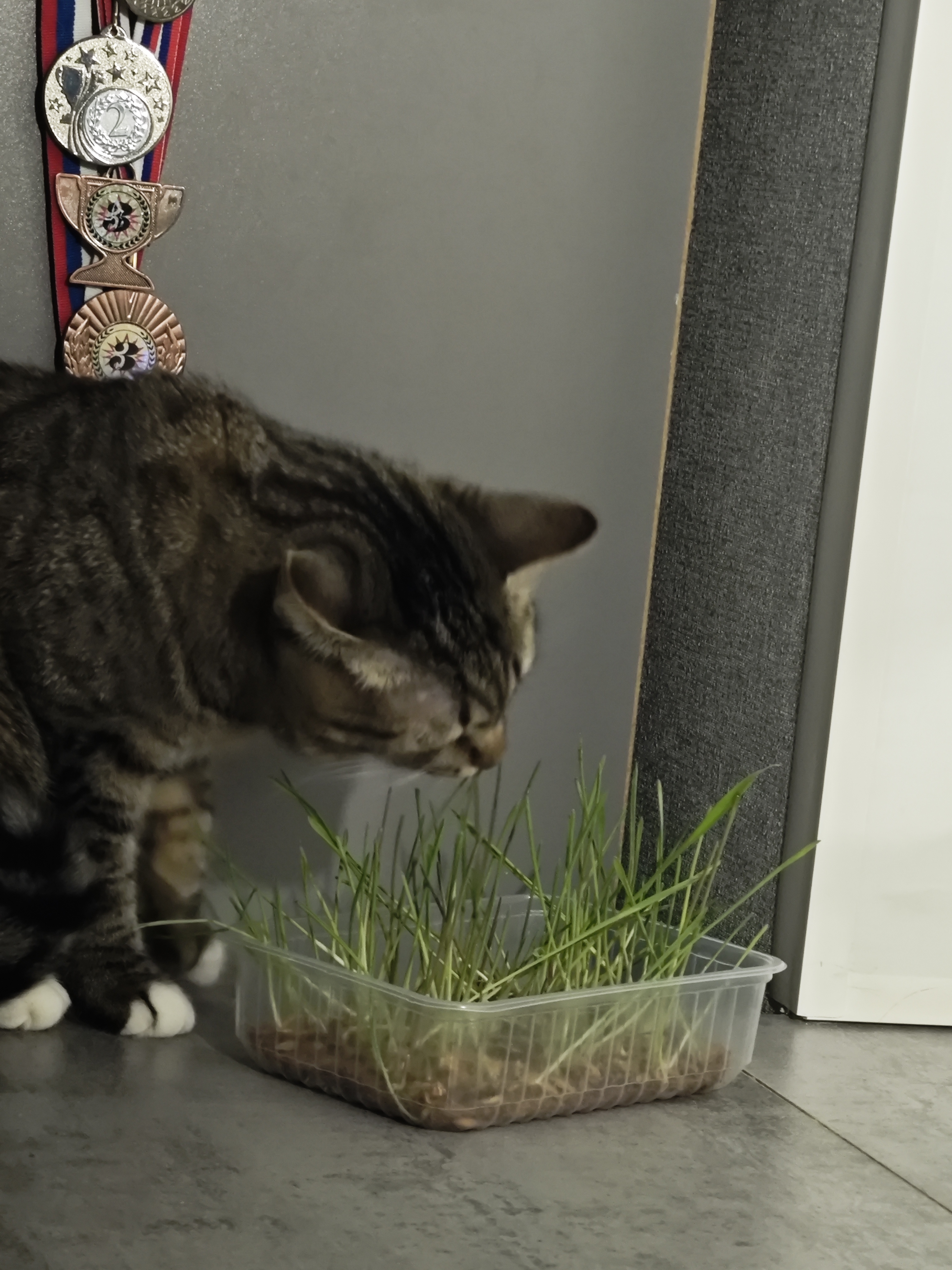 Кошка кушает травку